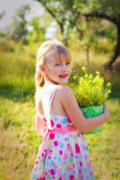 Улыбающаяся маленькая девочка с ведром с цветами в парке