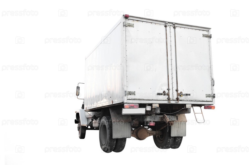 Грузовой автомобиль на белом фоне. Вид сзади