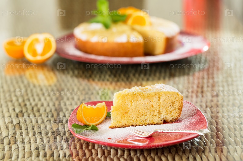 Ломтик апельсинового пирога на красной тарелке