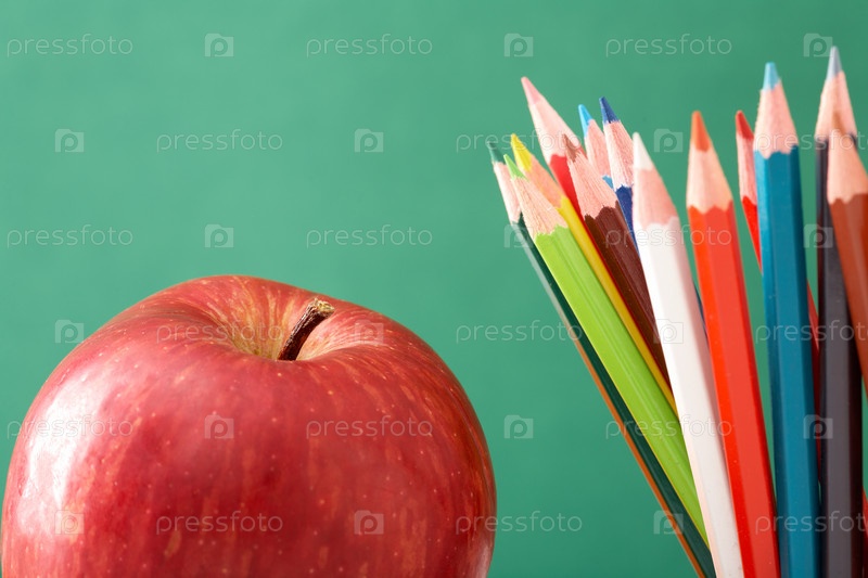 Красочные карандаши и яблоко