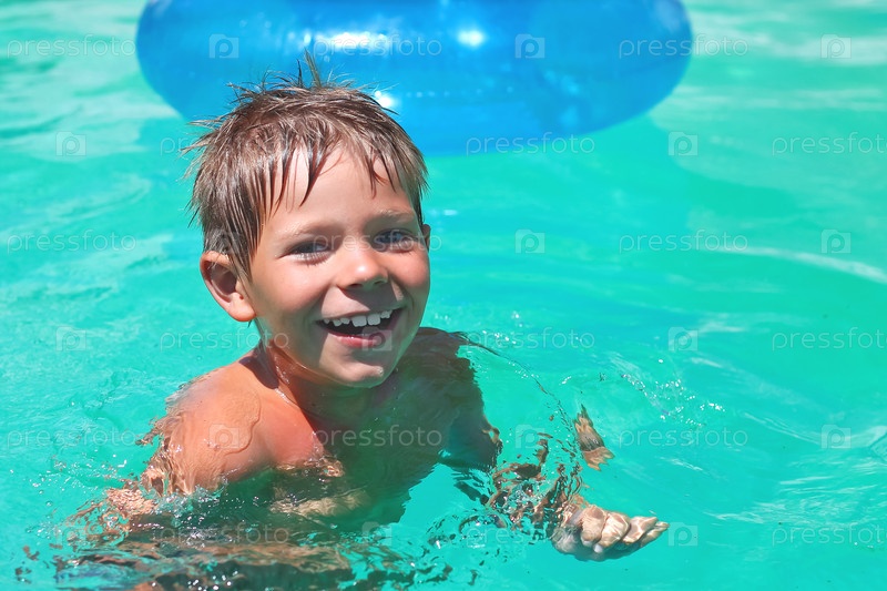 Улыбающийся мальчик в бассейне на летних каникулах