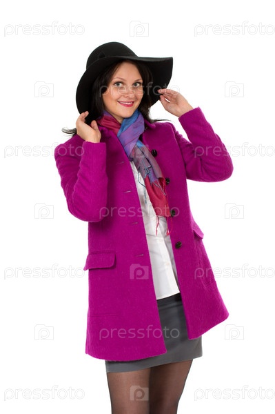 Жизнерадостная девушка в пальто и шляпе