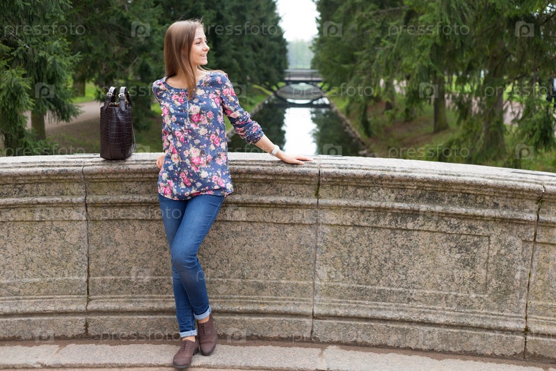 Красивая молодая девушка на старом каменном мосту