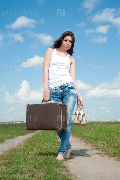Красивая женщина со старым чемоданом