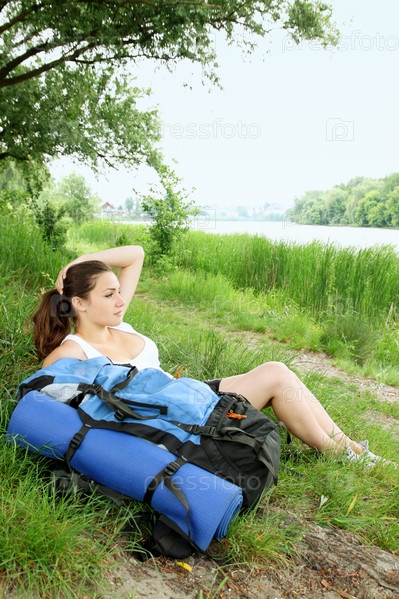 Женщина с рюкзаком отдыхает на берегу реки