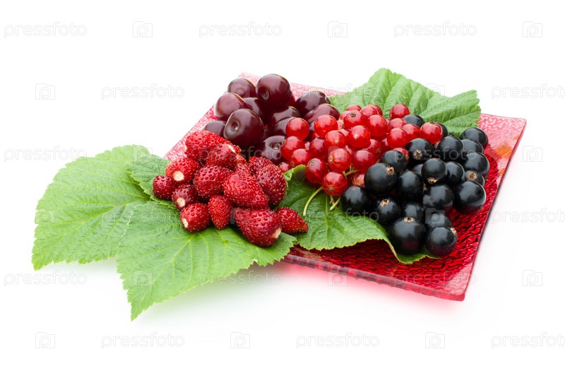 Различные ягоды на красной тарелке