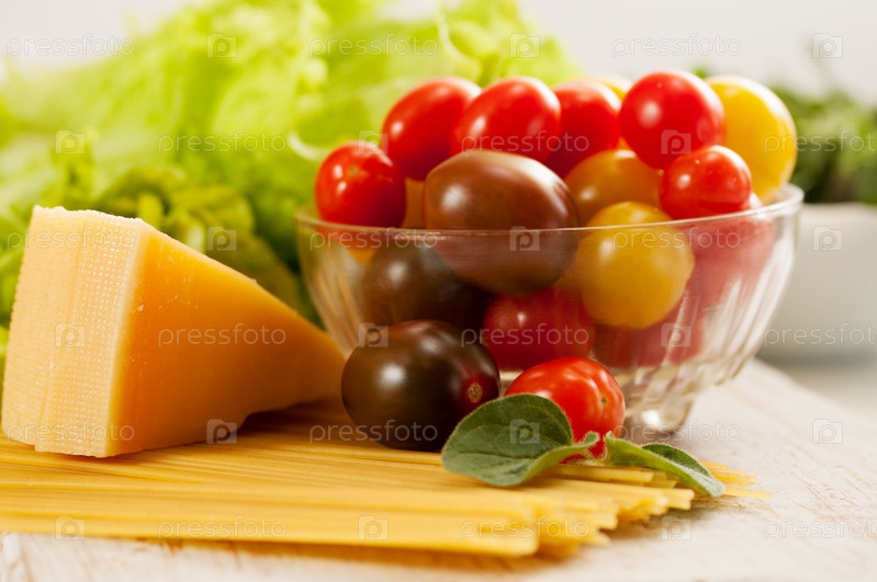 Сырые спагетти с помидорами и сыром пармезан