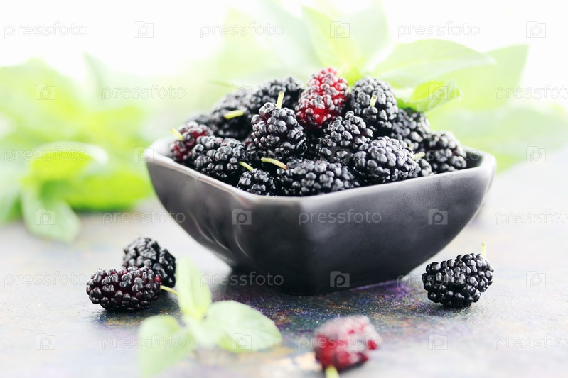 Спелая черная шелковица в черной тарелке