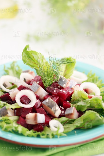 Салат из сельди, свеклы, листьеы свеклы и семян кунжута