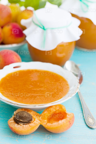 Свежие абрикосы и абрикосовое варенье, натюрморт