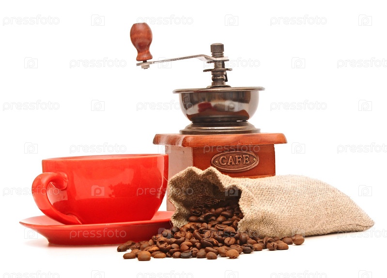 Старая деревянная кофемолка и мешок с кофейными зернами, изолированные на белом фоне