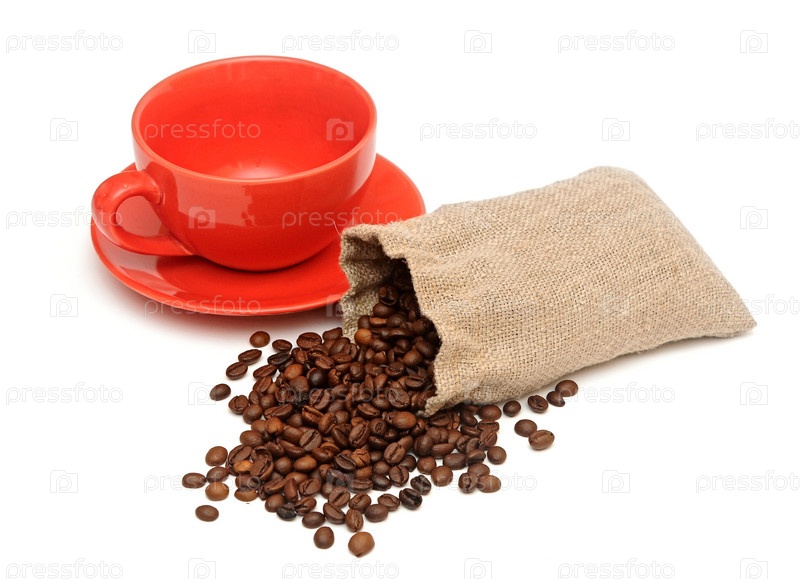 Красная чашка и мешок кофе, белый фон