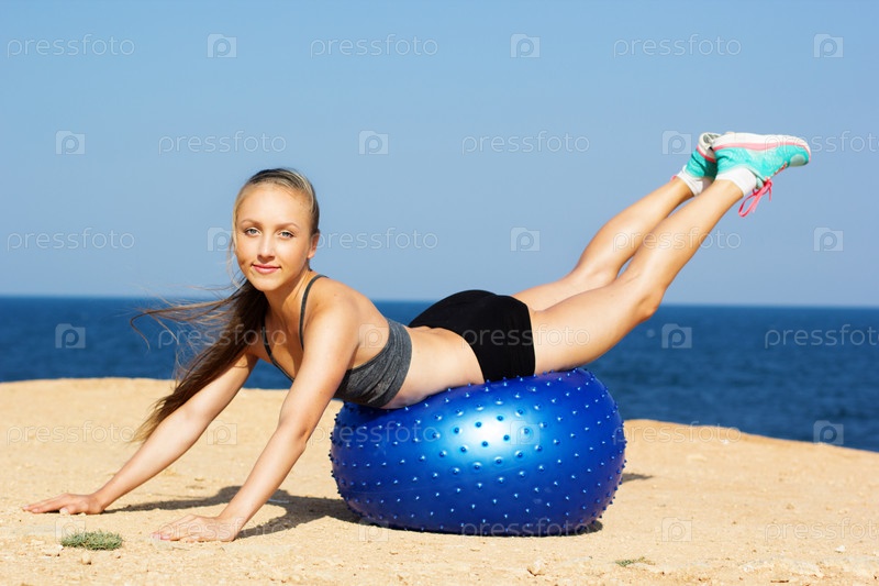 Молодая счастливая женщина делает фитнес-упражнения на мяче