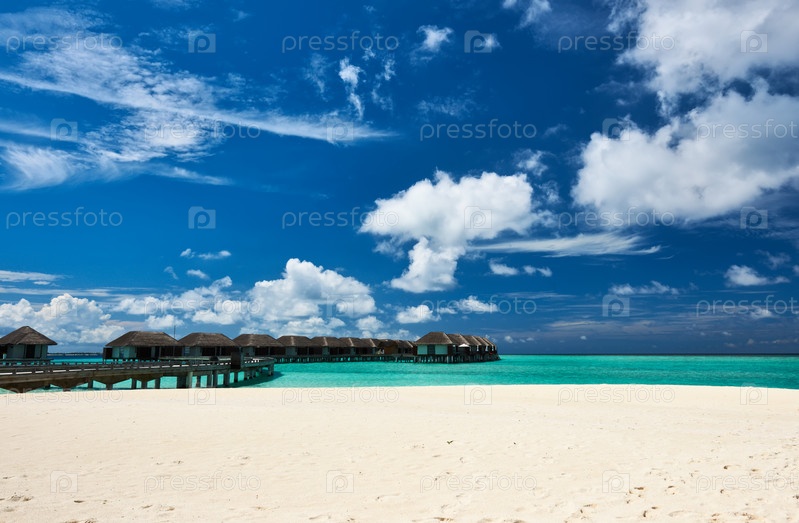 Красивый пляж с водными бунгало