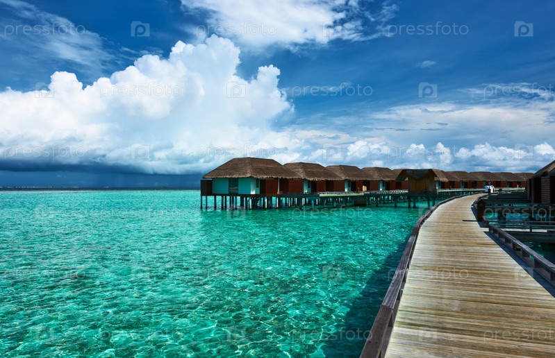 Красивый пляж с водными бунгало
