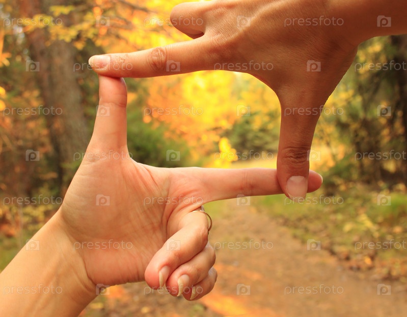 Пальцы, сложенные в виде фотокадра на фоне осеннего леса