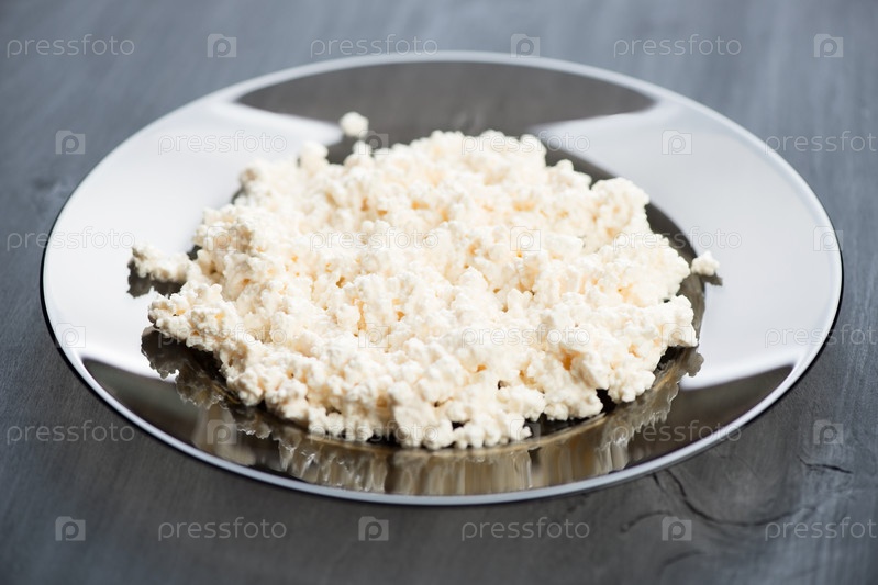 Стеклянная тарелка со свежим творогом на деревянных черных досках