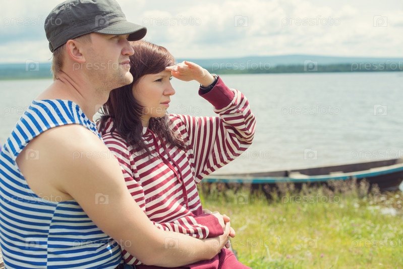Молодая пара сидит у озера и смотрит вдаль