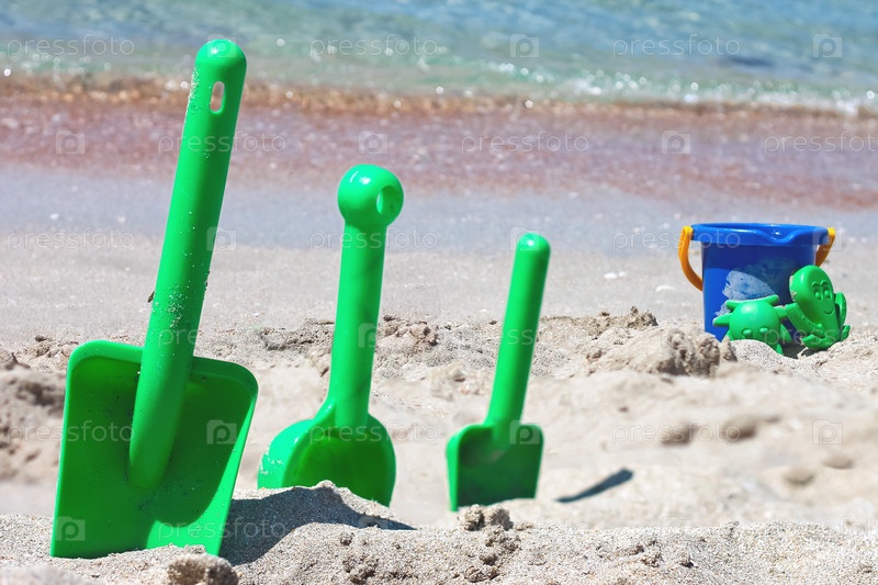 Детские игрушки на пляже на берегу моря