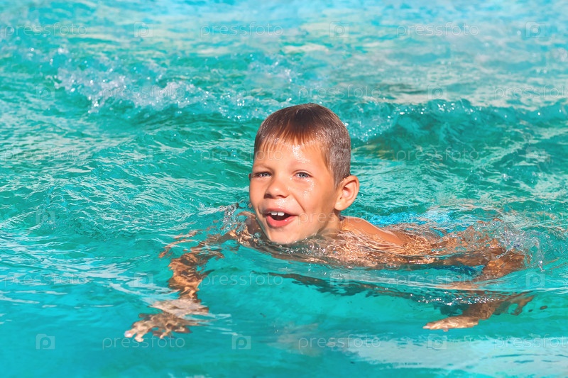 Улыбающийся мальчик в бассейне на летних каникулах