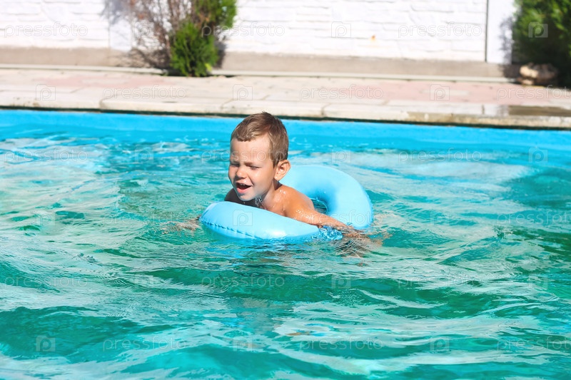 Улыбающийся мальчик в бассейне на летних каникулах