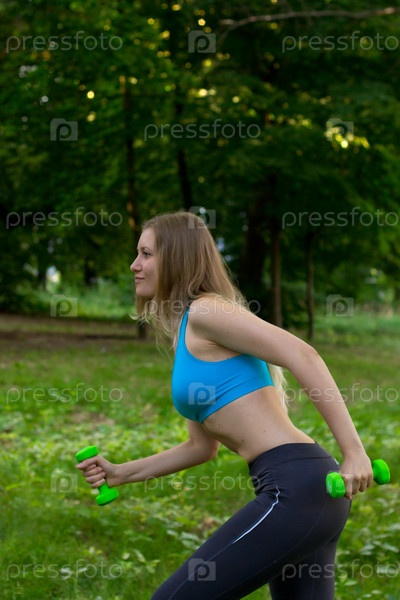 Молодая женщина занимается с гантелями