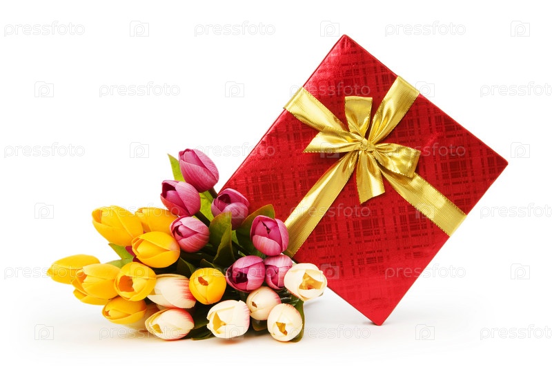 Красивый подарок и букет тюльпанов