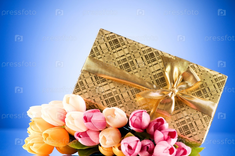 Красивый подарок и букет тюльпанов