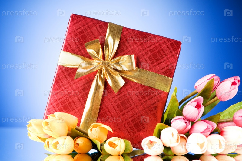Красивый подарок и букет тюльпанов