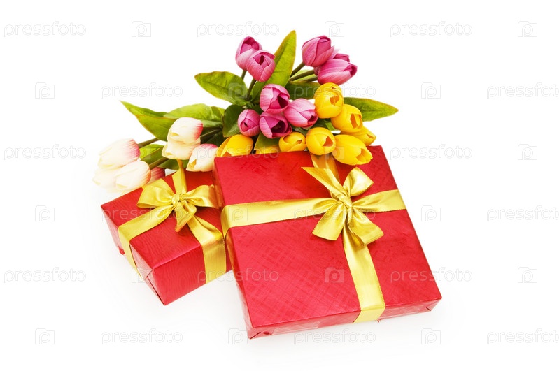 Красивые подарки и букет тюльпанов