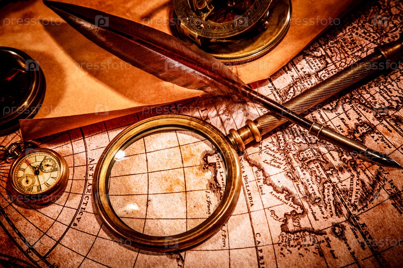 Винтажное увеличительное стекло лежит на карте древнего мира