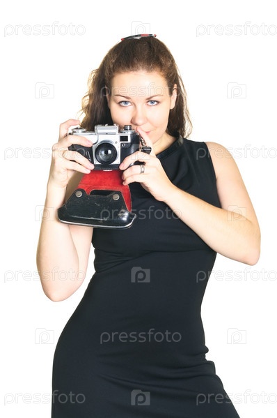 Девушка в черном платье со старым фотоаппаратом на белом фоне