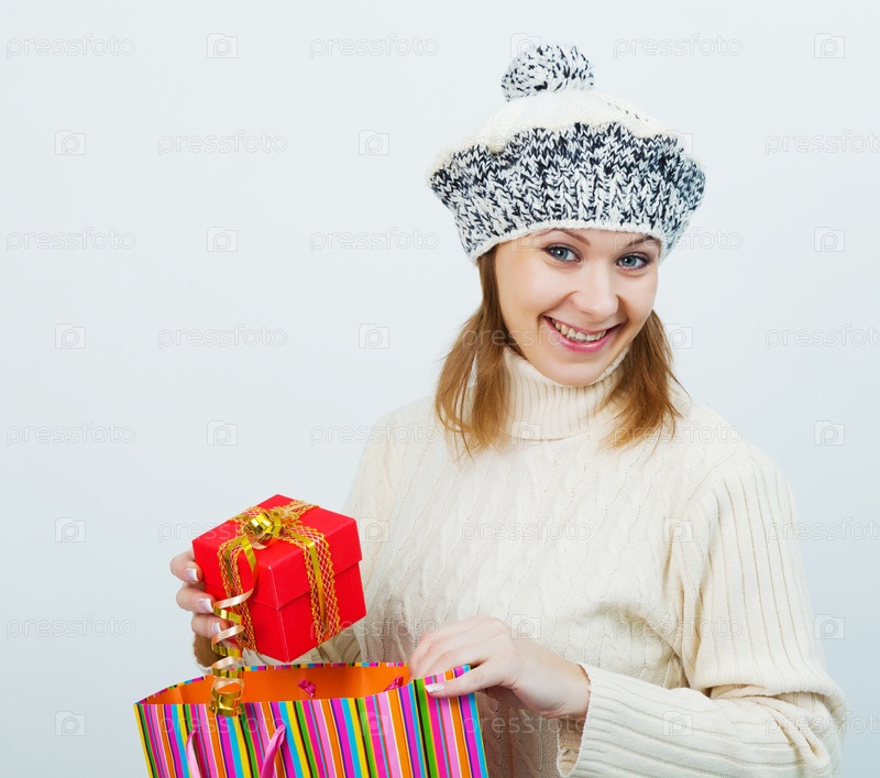 Привлекательная девушка в свитере с подарком