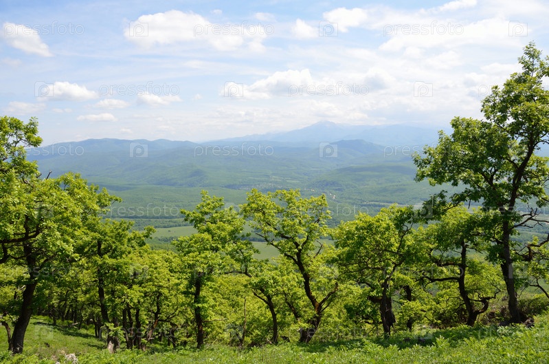 Адыгея, горный пейзаж весной. На заднем плане главный Кавказский хребет