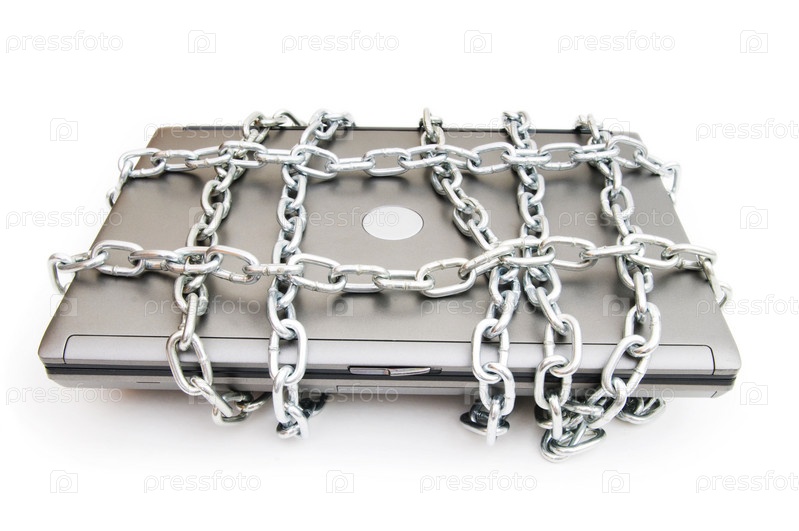 Ноутбук, опутанный цепями. Изоляция на белом фоне