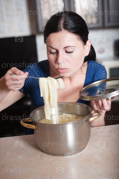 Молодая хозяйка готовит блюда на кухне