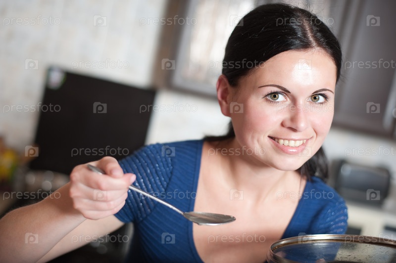Молодая хозяйка готовит блюда на кухне