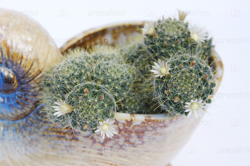 Цветущий кактус в горшке в виде ракушки