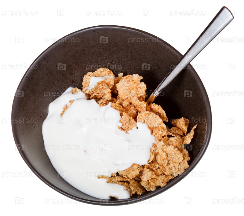 Йогурт и ложка в чаше хлопьев