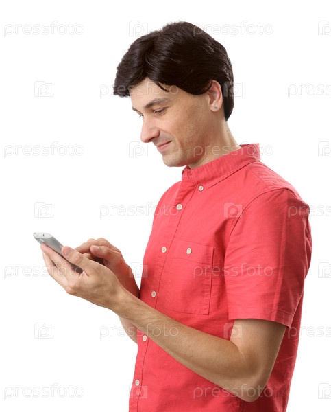 Мужчина читает текстовое сообщение на мобильном телефоне