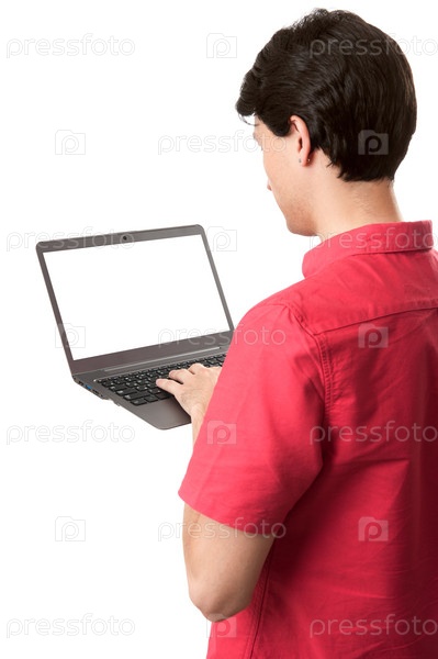 Вид сзади человека, использующего ноутбук с пустым экраном
