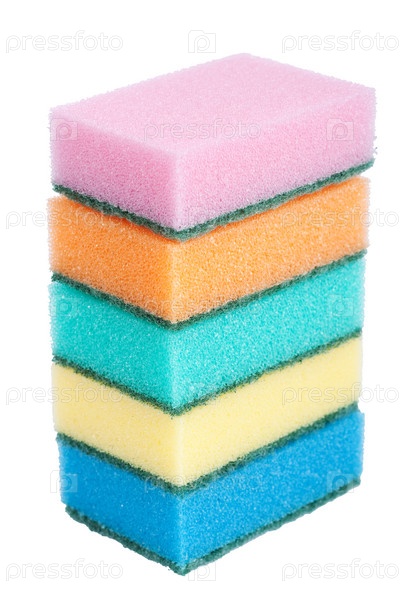 Пять разноцветных губок для посуды на белом фоне
