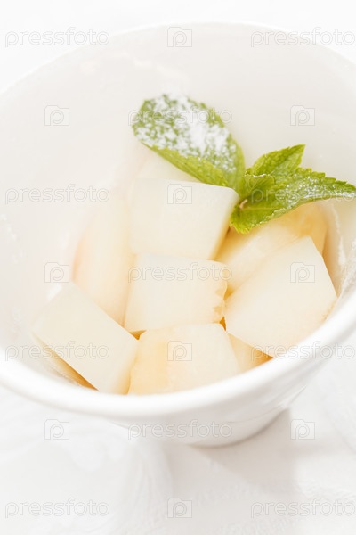 Листья мяты на кубиках свежей дыни