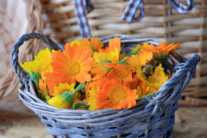Сорванные цветы календулы лежат в корзине