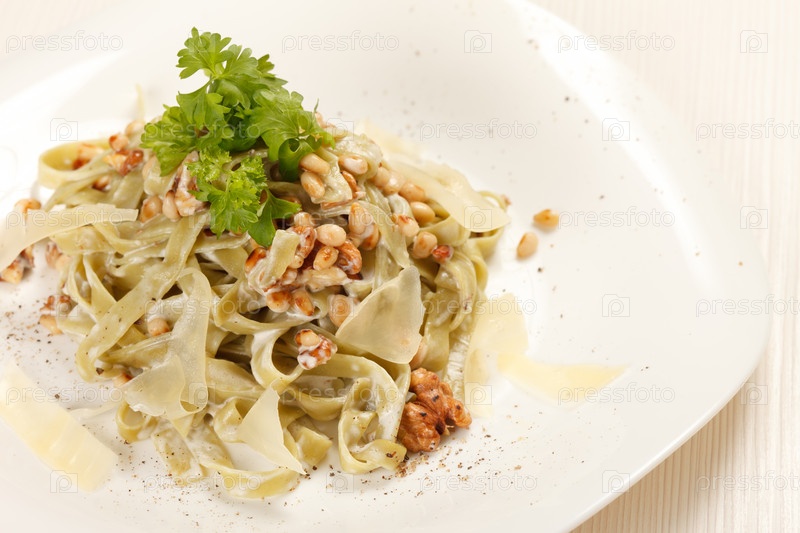 Макароны с сыром и кедровыми орешками