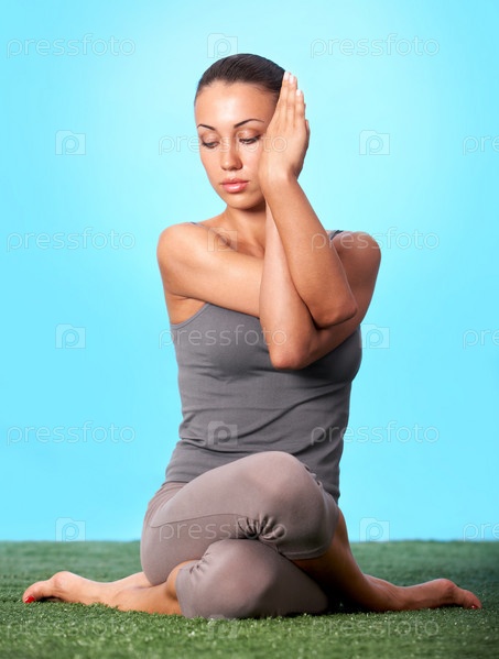 Девушка занимается йогой на траве. Изолированная на голубом