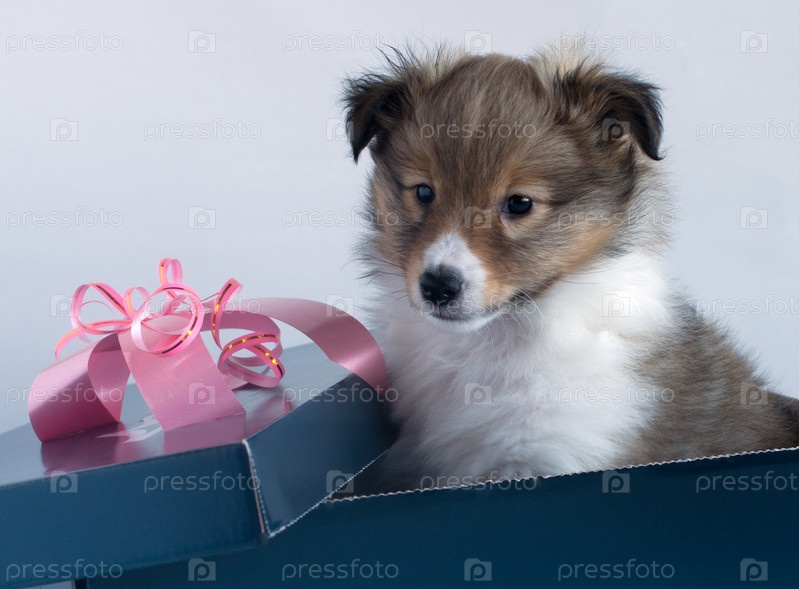 Щенок шелти в подарочной коробке