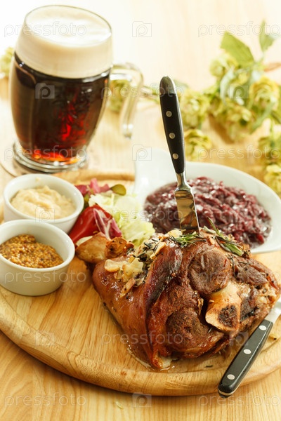 Айнсбайн с тушеной капустой, картофельным пюре и пиво