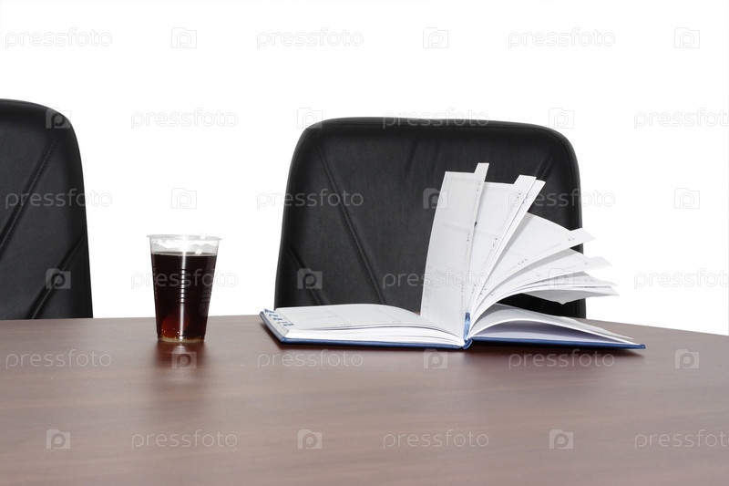 Раскрытый ежедневник и стакан с чаем на столе в конференц-зале