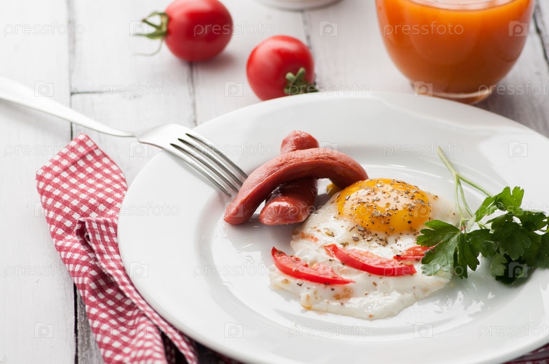 Яичница с кусочками помидора и колбасой на тарелке
